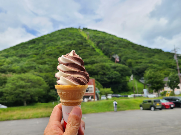 お昼は初めての「あさひ亭」でカレーそばをいただき、定番のソフトクリームを食べて